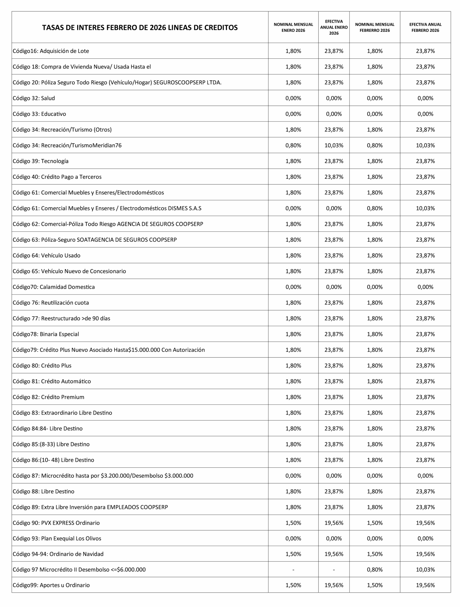 El Consejo de Administración de la Cooperativa de Servidores Públicos y Jubilados de Colombia COOPSERP COLOMBIA, conforme a lo establecido por la entidad competente determina para el periodo comprendido del 01 al 31 de Enero de 2026 las siguientes tasas de interés: